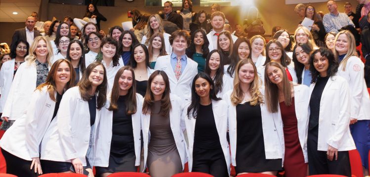 Class of 2027 physician assistant students pose after the ceremony with their new white coats. Credit: Ashley Jones.